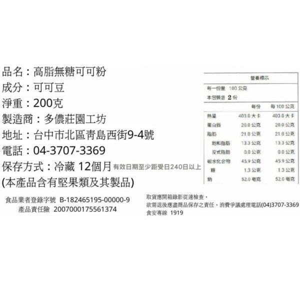 多儂莊園高脂無糖可可粉200g (台灣)
